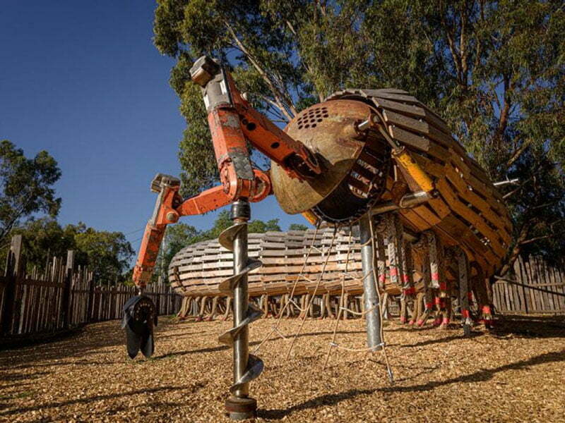 After consultations with kids focus groups and input from a volunteer team of amazing playground designers we created a recycled junk wonderland ruled over by a giant millipede as long a city tram.