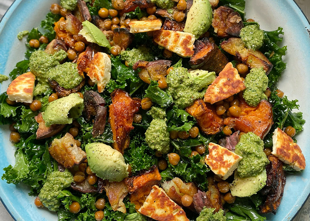 Salad time: Combine lemon juice, oil and salt and pepper in a small bowl and then pour it evenly over the kale. Using your hands, massage the dressing into the kale for a couple of minutes until it’s tender. Top kale with roast veg, chickpeas, chucks of avocado, cheese (if using) and dot the pesto over the top.