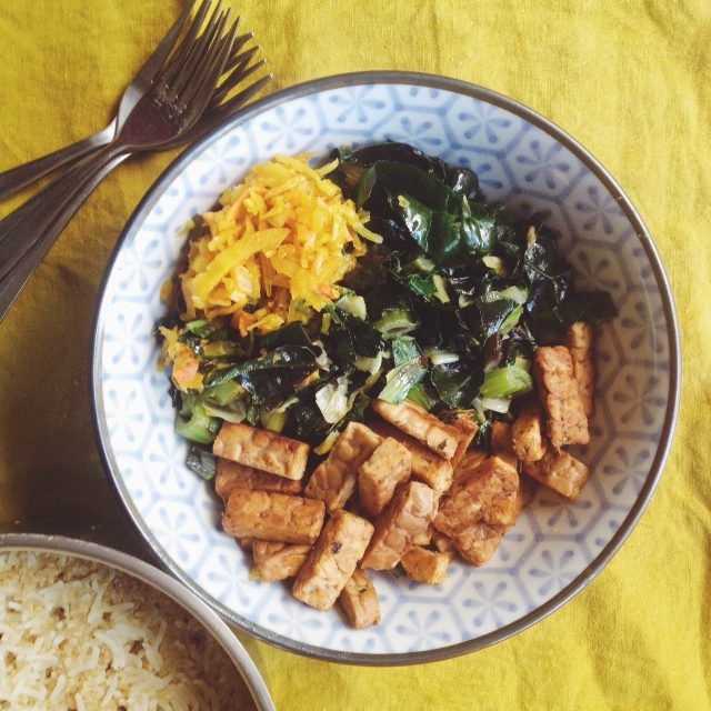 Lightly fry the green’s stems, chopped leek and ginger in a little oil. Once they begin to soften add garlic (optional) and the rest of the green leaves. Essentially you are adding the veggie elements from most sturdiest (kale, stems, broccolini) to least (chard leaves, spinach), lightly stirring. The moisture in the greens will help to keep the pan juicy and yum. By the time your quinoa-rice is cooked, you’ll have a bright mix of flavoursome greens. Season with salt and little squeeze of lemon.