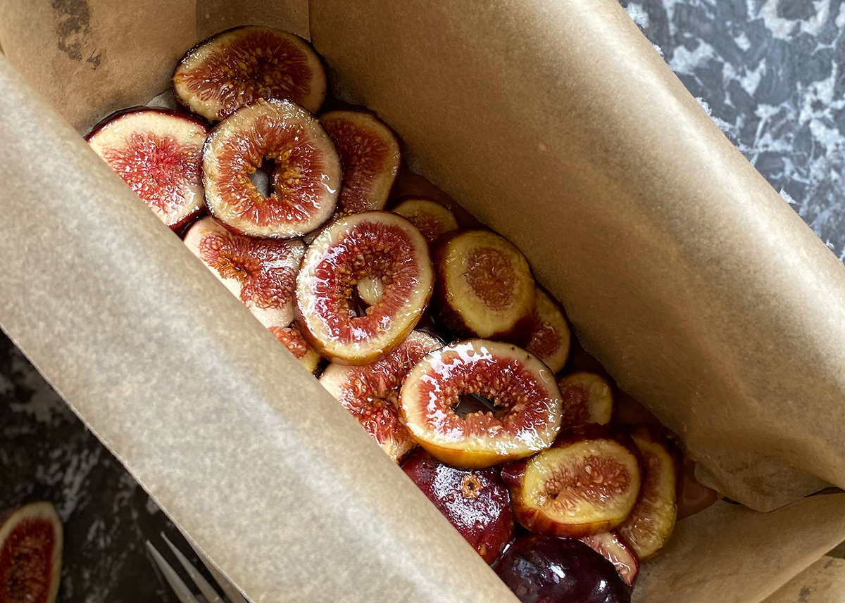 Layer the soaked fig slices at the bottom of your lined loaf tin, positioning the prettiest parts so that they are facing down and flush against the parchment.