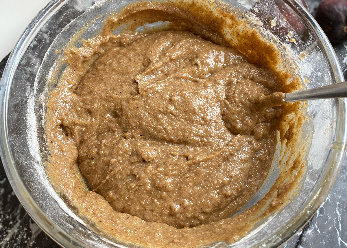 Add in the rye flour, cinnamon, baking powder and salt. Mix, first with your whisk, then smooth out with a spatula. This batter will be very, very thick, but don’t mind it.