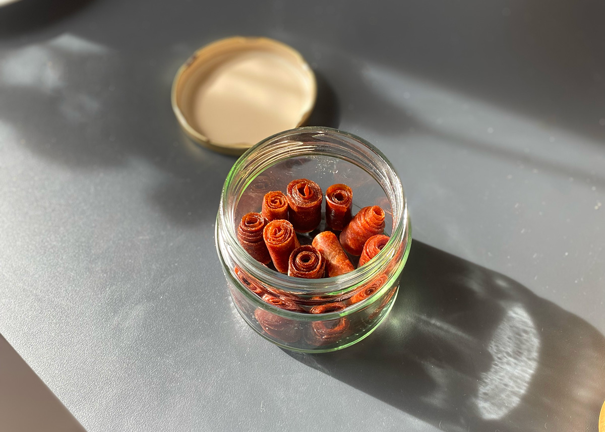 Once cool, use a pizza slicer, or a sharp knife to cut the leathers into strips and roll them up into pinwheels.
