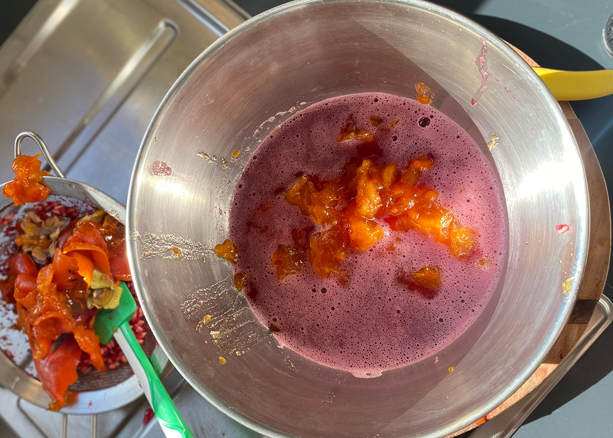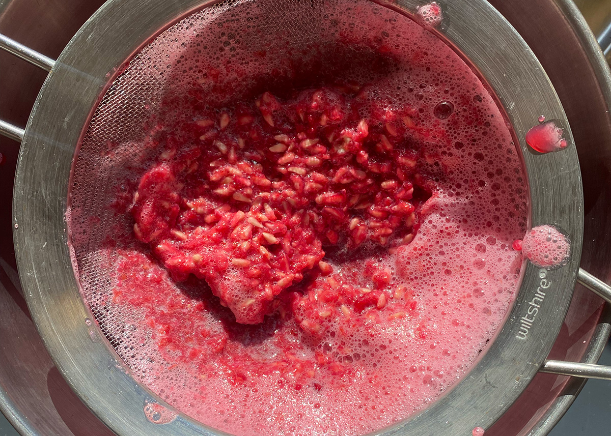 Strain the liquid through a fine sieve over a large bowl, compost any seeds etc.