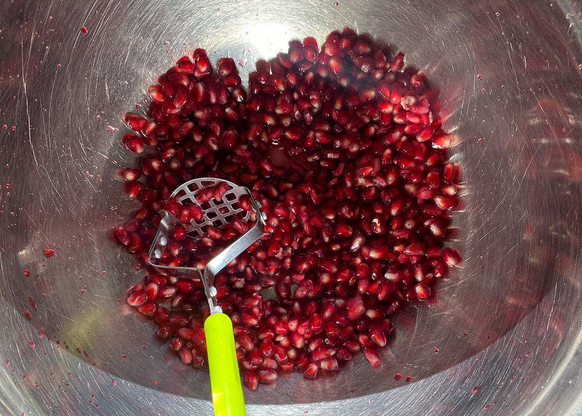 First up, put the pomegranate seeds in a bowl with a splash of water and use an immersion blender to extract the juice, you could use a regular blender too (we started with a potato masher but it was fruitless, hehe).