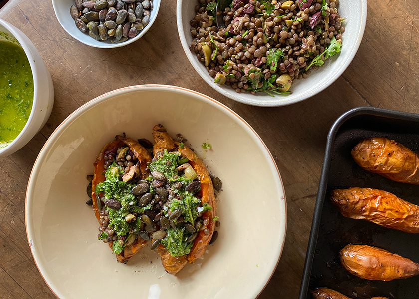 To serve, slice each sweet potato down the centre and push the flesh down with a fork to form a well. Fill with lentil olive mixture. Drizzle over green sauce and scatter over pumpkin seeds and a few cilantro leaves.