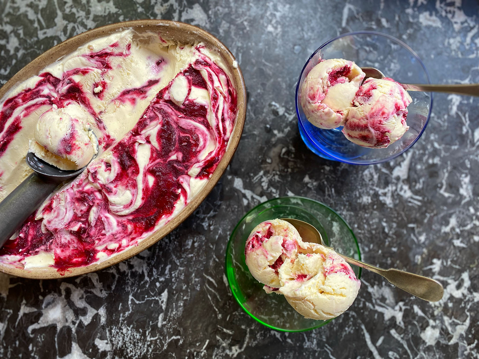 Clementine’s suggestions on other things to ripple through the vanilla base: marmalade, caramel or dulce de leche, jam of your choice but try something a bit more tart, lemon or lime curd, crunched up biscuits.