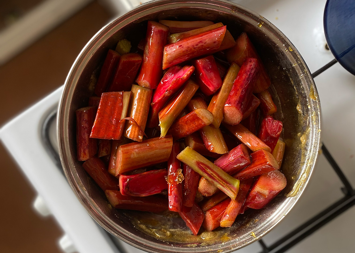 Once the burnt caramel is made, dump in your rhubarb stalks and stir to coat them all in the glorious sauce. Then put a lid on and leave it for 4 mins. Take the lid off, stir, then return the lid. Do this until the rhubarb has completely disintegrated into a glorious compote – ours took about 20 mins.