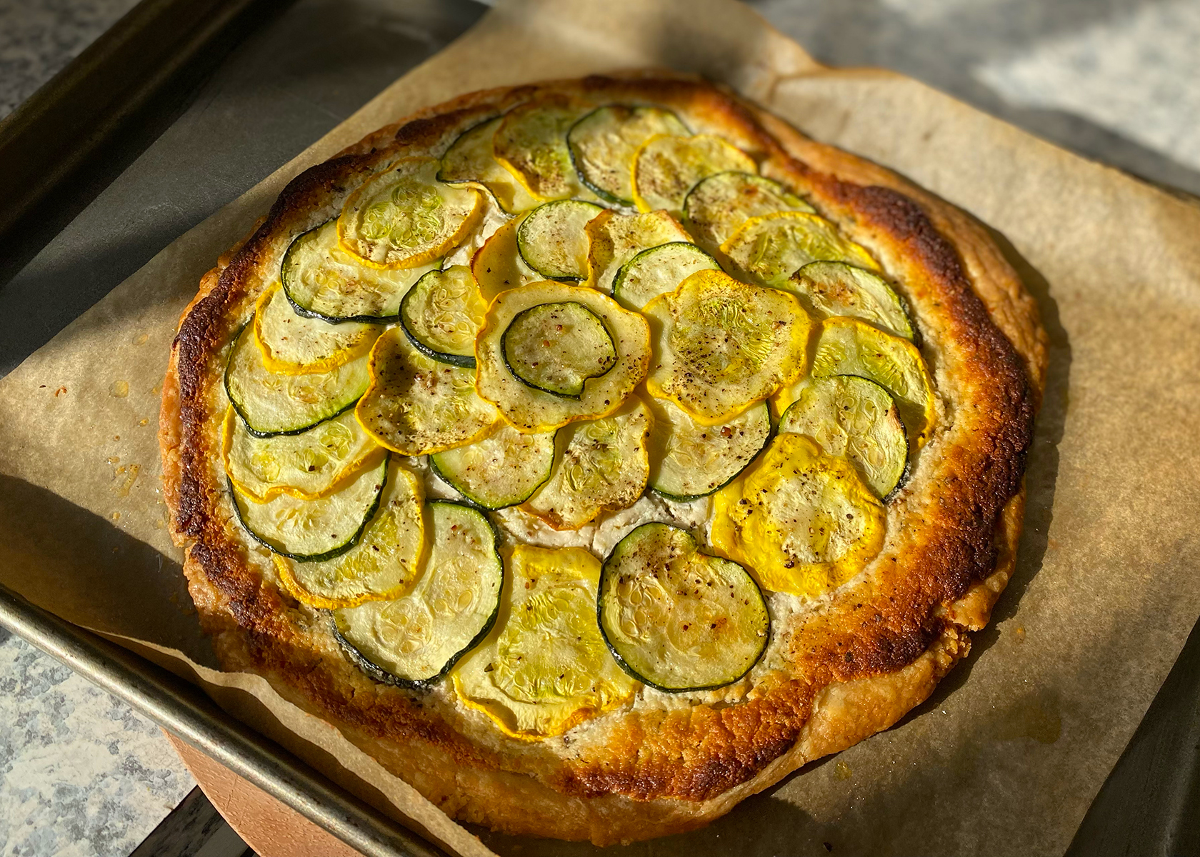 Roll the dough out on a floured bench to a 30cm circle that is evenly 0.5cm thick. Place pastry on a baking tray lined with baking paper. Spread the dough with the goat cheese mixture, leaving a 1cm border. Lay the zucchini/squash slices in tightly overlapping circles, starting at the very edge of the pastry (if you’ve got too many zucchini slices save them for a frittata or make a secondary ‘chef’s treat’ tart with the offcuts of pastry and zucchini). Drizzle the tart evenly with olive oil and season with pepper. Bake for 40 to 50 minutes, until the dough is golden brown.