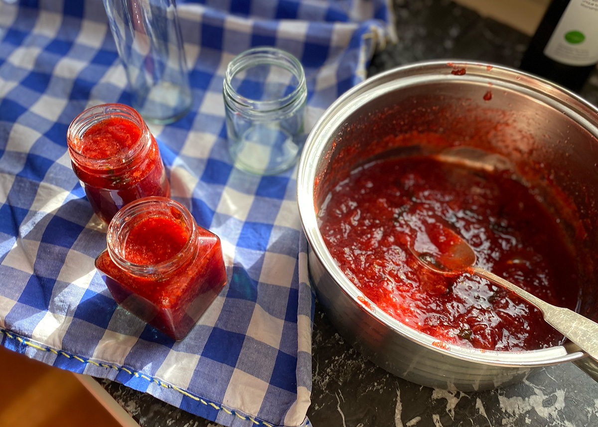 Place a small saucer in the freezer for 15 mins. Once the jam has thickened spoon a small blob on the cold saucer and return it to the freezer for 3 mins. Tilt the saucer vertically so the jam runs. You are aiming for a slow descent, not a runny mess. Alternatively, drag your finger through the jam, if the jam remains divided you’re set!