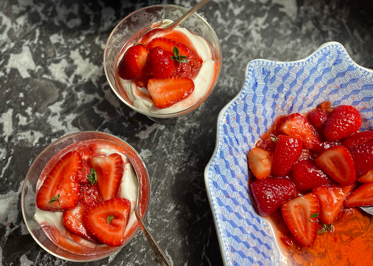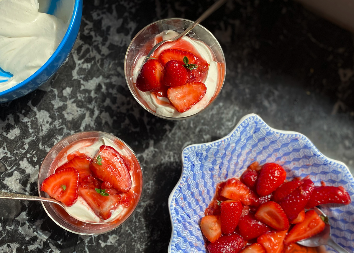 Sometimes it’s best to keep things simple. New season organic strawberries, are practically perfect right out of the punnet, but to make them just slightly more delicious we macerate them in a lil bit of sugar and thyme and pile them on top of luscious vanilla cream. Light and lovely, enjoy!