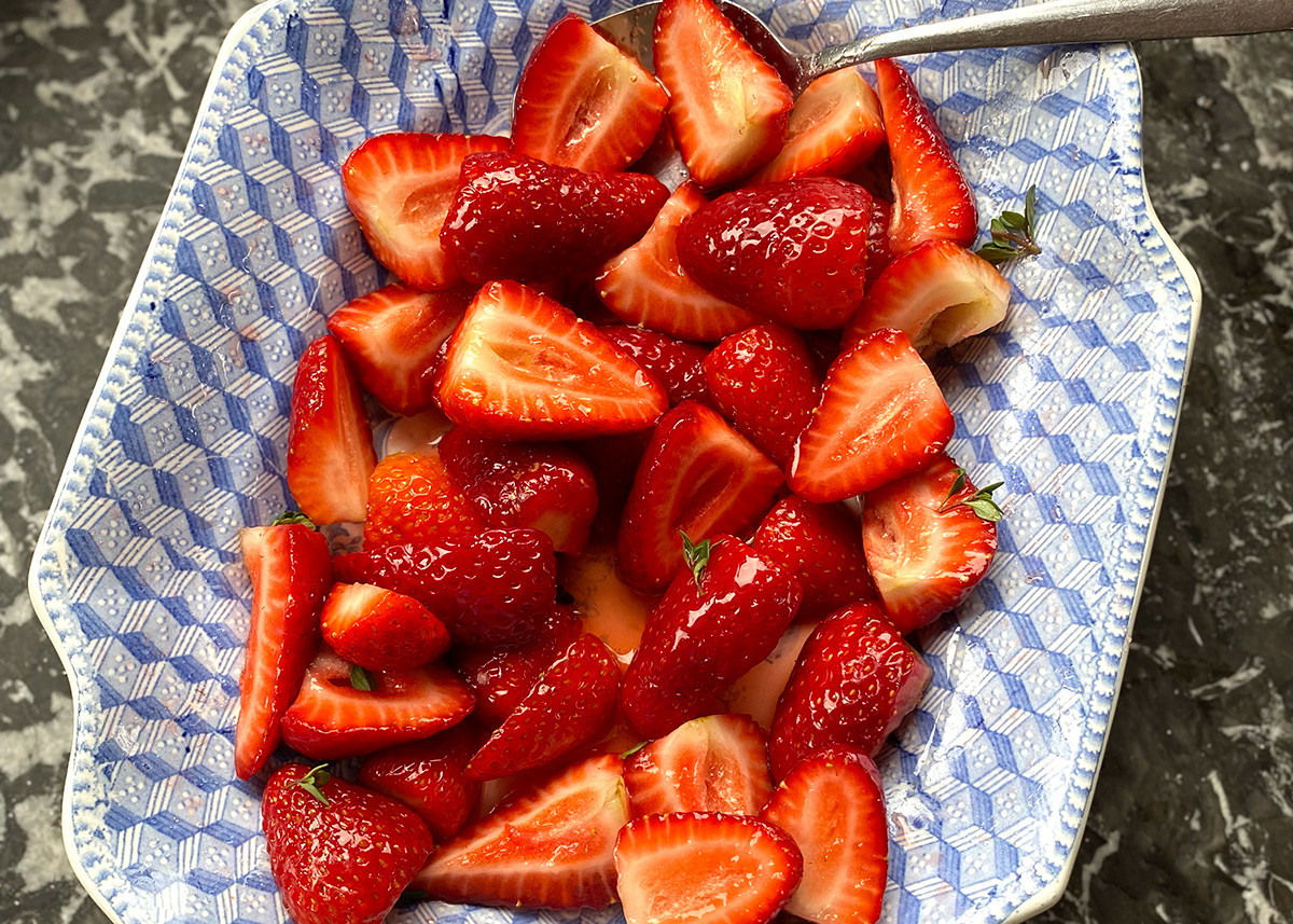 Wash and halve/quarter the strawberries. Place in shallow dish and sprinkle with 2-3 tbsp sugar and thyme. Drizzle lemon juice over the top and mix it all round to combine. Leave to macerate for an hour or two, stirring occasionally.