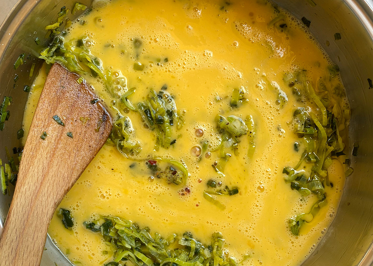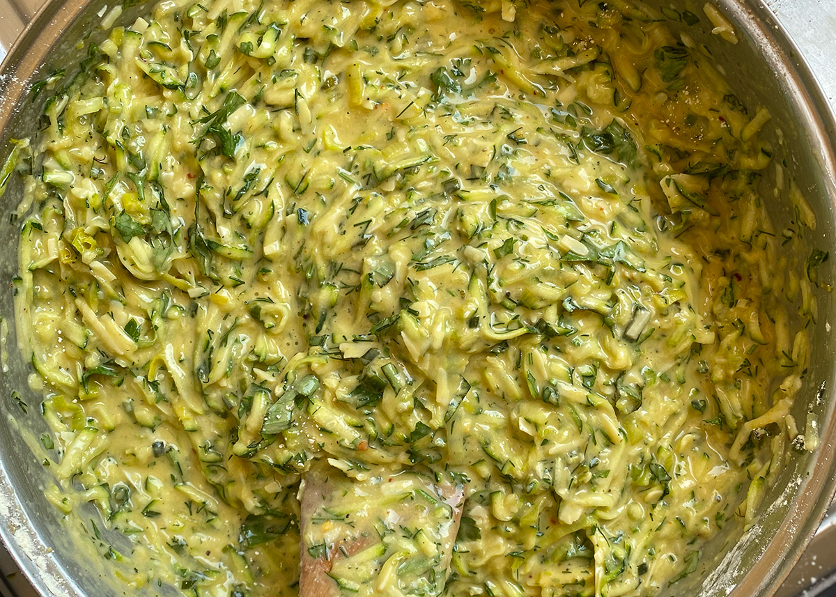 In a large bowl, whisk eggs until combined. Add cooled leek mixture to eggs, then stir in zucchini, cheese, chilli flakes and herbs. Sprinkle flour, baking powder over the wet ingredients. Season again and mix gently until smooth.