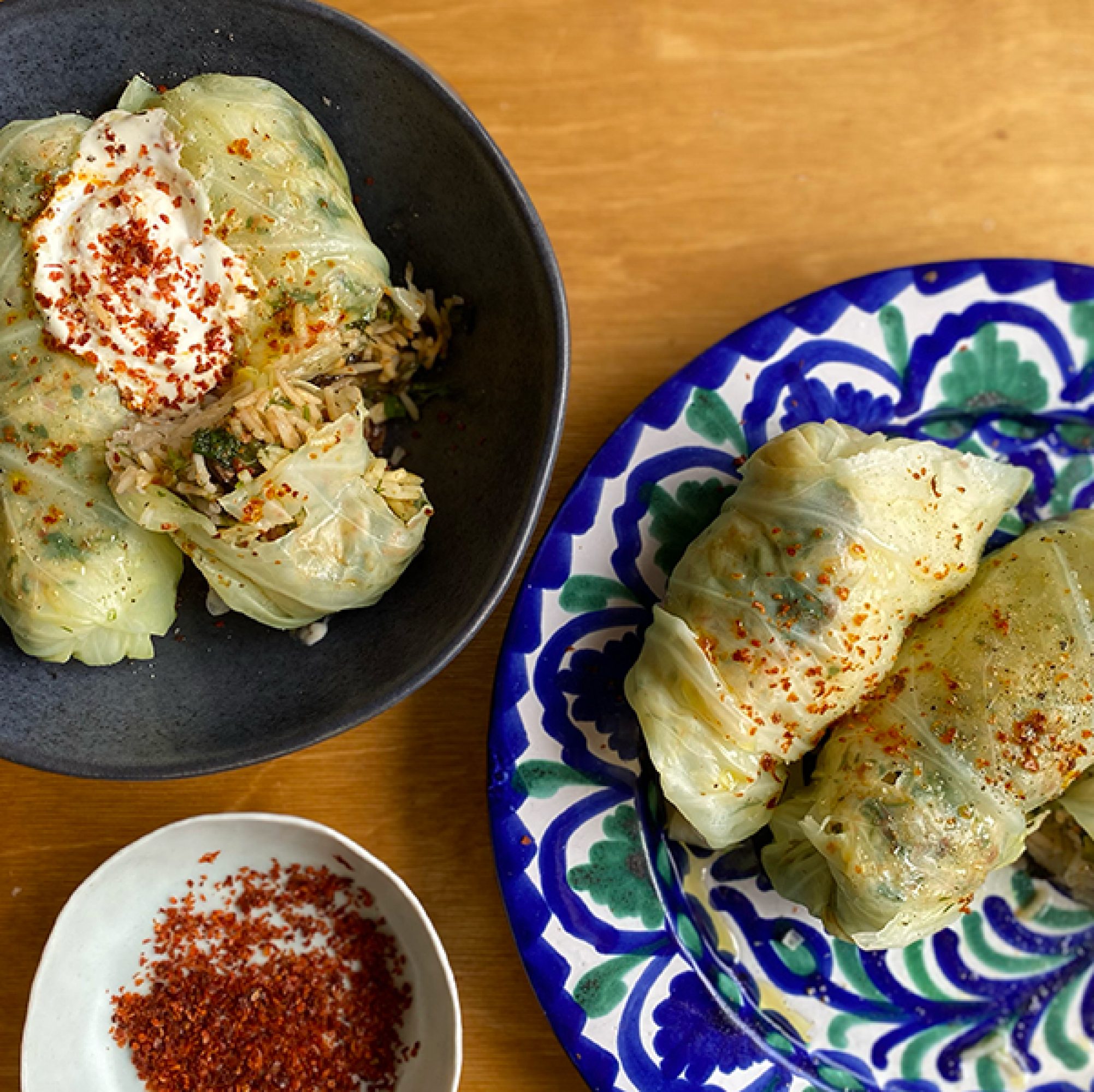 This recipe is for the love of spring cabbage! Each tender green leaf is filled with a fragrant and tart mix of warm rice, buttery pine nuts, fresh herbs and sour sumac.