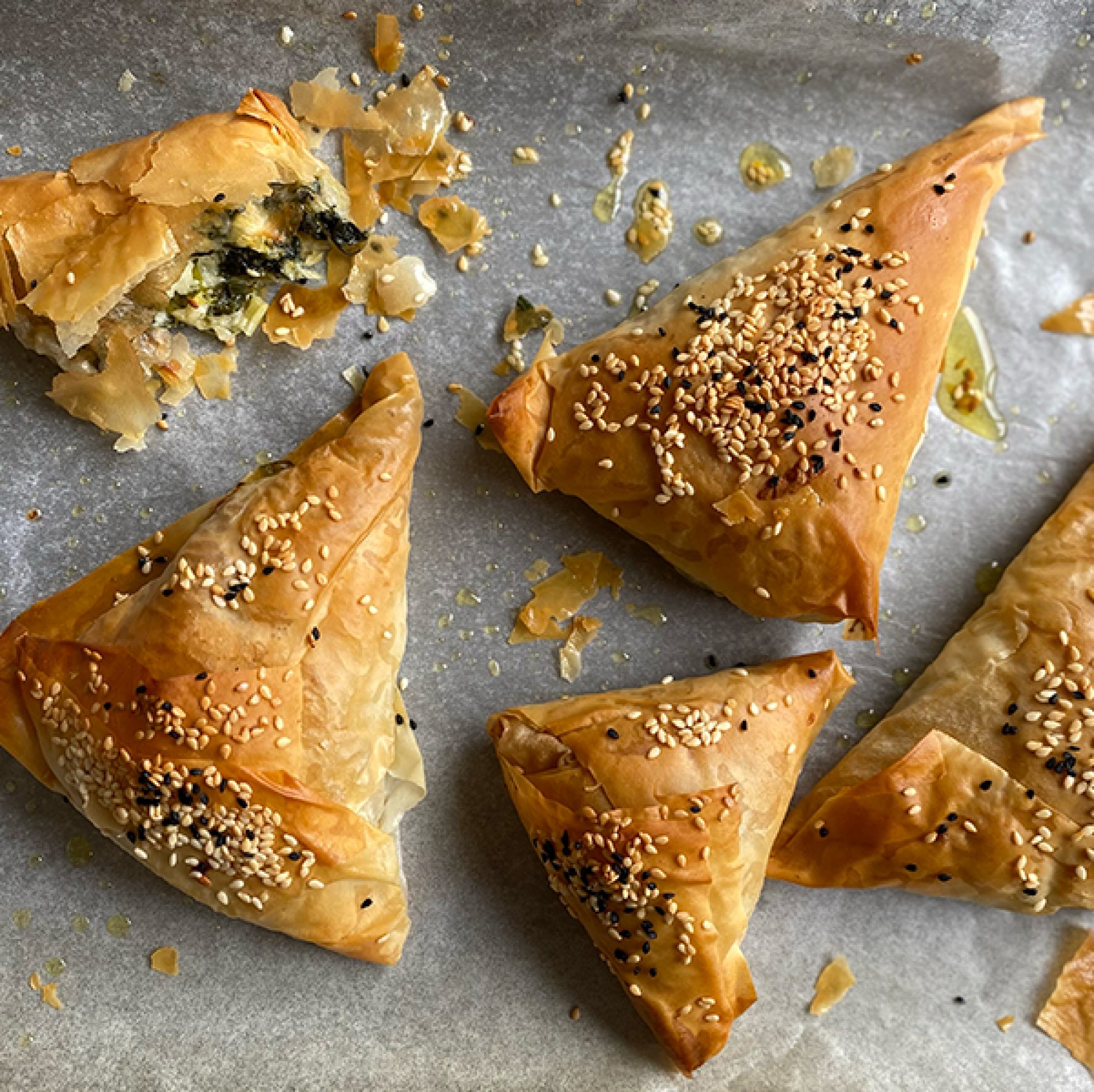 A public holiday cooking project! These cheesy spinach triangles are crispy-salty-delish and inspired by spanakopita and börek. Choose to make them bitesize for a party or larger for a light meal/lunchbox treat.
