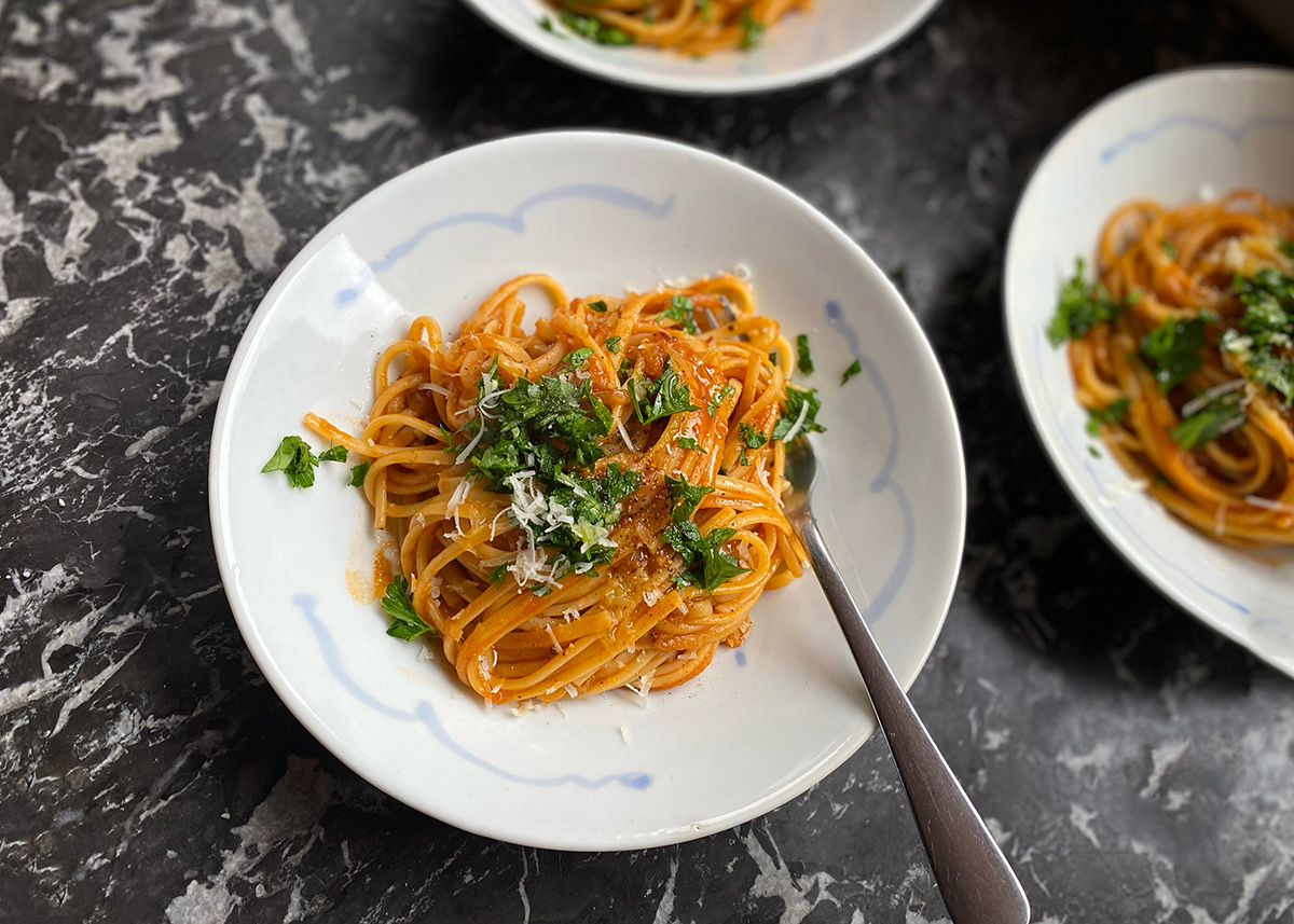 This pasta is all about the shallots, cooked down in a bath of olive oil, tomato paste and anchovies to a jammy, caramelised paste.