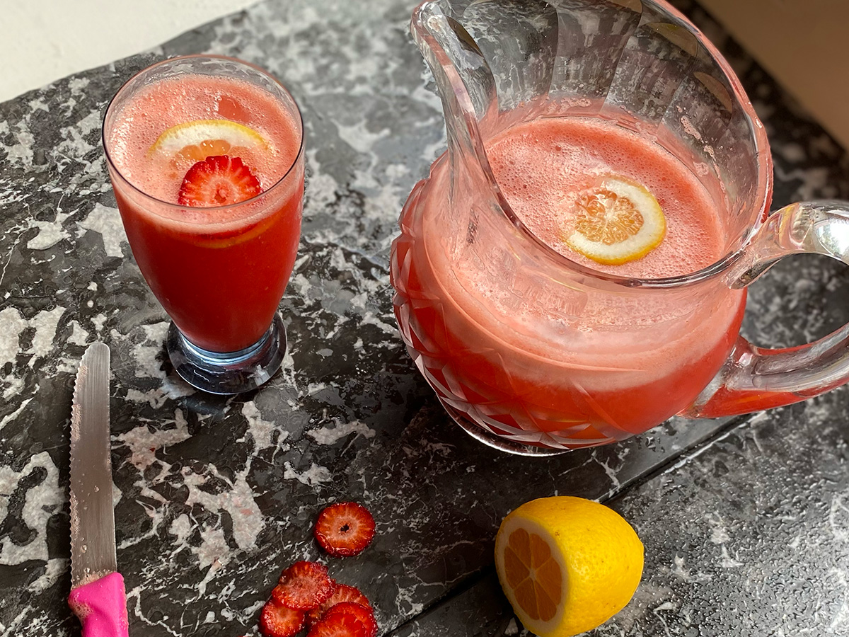 Summer days call for fresh fruit spritzes. We love this simple strawberry lemonade as a alcohol-free refreshment!